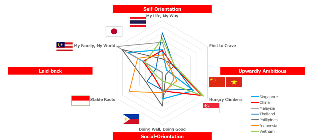 LOUIS:全球Z世代几乎都在数字环境中成长,亚洲也不例外。该地区的Z世代有许多共同点,例如擅长使用社交媒体、具备较强的情绪感知力,渴望找到志同道合的伙伴以获得群体归属感。但更关键的是差异部分,而这些差异主要源于各国独特的宏观社会环境。不同社会环境塑造了不同的价值观。我们通过两个维度——“自我取向与社会取向”以及“积极进取与悠然随性”来描绘各国的Z世代画像。比如,中国和越南的代表性类型是“渴望上升的攀登者”,他们认同金钱是成功的象征,追求社会认可,倾向选择能展现身份的品牌。新加坡的Z世代则兼具“攀登者”与“家庭至上”两类特质,重视家庭关系。泰国的Z世代则更强调随性自在,他们的典型形象是“我的生活我做主”。而马来西亚、印尼和菲律宾的Z世代普遍更看重家庭和宗教传统,因此强调社群归属的品牌更能打动他们。