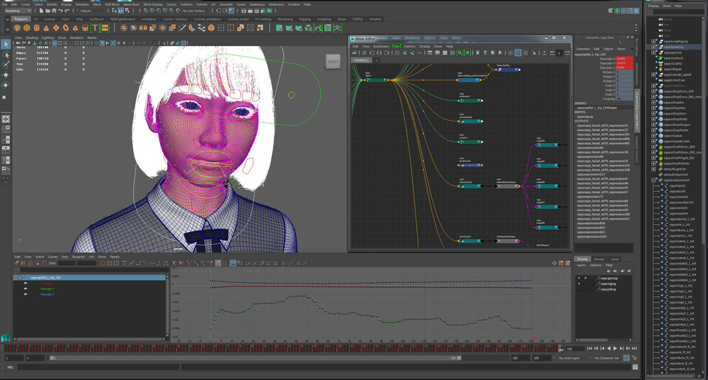在运用AI时,首先想到的便是“语言”。也就是“要让Saya说点什么”。但是语言其实(笑)超难,而且,将嘴部动作和声音做到匹配,这尤其是难上加难的事。如果要让看到的人吓一跳,采用其他方法是否会更好呢?我们得出了这样的结论。当时我们首先想到的便是运用表情识别AI实现以感情进行沟通。而质量非常高的图像,仅1秒的素材便需要几个小时的渲染才能完成。本来需要花费这么多时间的过程,却能配合观众的表情和动作不断地发生即时性的变化,那么对影像技术有一定程度了解的人就会将其视作变魔术,而对于不懂技术的人而言,高画质的影像能实时以互动的方式作出回应,这将是一种不曾体验过的惊喜。我觉得,如此制作出来的作品,将成为不管技术运用能力如何,对任何人而言都是十分有意思的作品。
