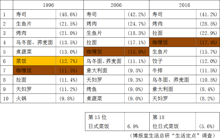 2016年“拉面”进入了前3名。实际上,它是步步紧逼,才占据了今天的位置。20年前“乌冬面、荞麦面”曾经胜过“拉面”,但在10年前排名发生了上下逆转,到了2016年,甚至拉开了两倍的差距。