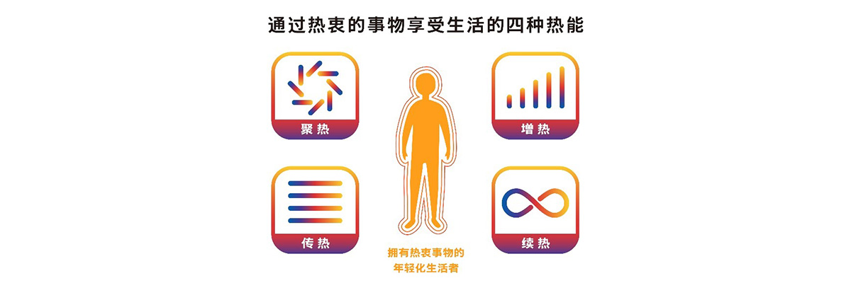 满足这四类欲求的同时,让自身内在不断成长,永远保持年轻心态的“热活族”,拥有超越年龄限制获得存在感。